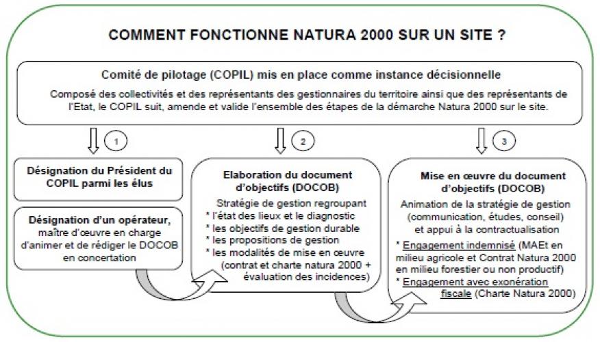 La concertation repose principalement sur un comité de pilotage (COPIL) qui est mis en place par le préfet coordinateur pour chaque site Natura 2000. Cette instance décisionnelle regroupe les collectivités, les services de l’état, les organismes socioprofessionnels et les associations locales. Le comité de pilotage a pour rôle de suivre, d’amender et de valider chaque étape de la démarche.